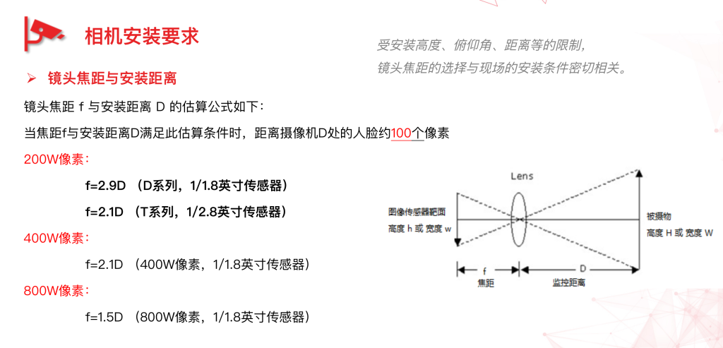 相(xiàng)機焦距f和(hé)監控距離(lí)D之間的(de)經驗計(jì)算公式(人(rén)臉像素約100):