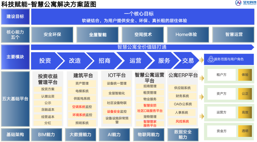 五大(dà)基礎平台:投資收益管理(lǐ)平台、建築平台、IOT平台、智慧公寓運營平台、公寓ERP平台