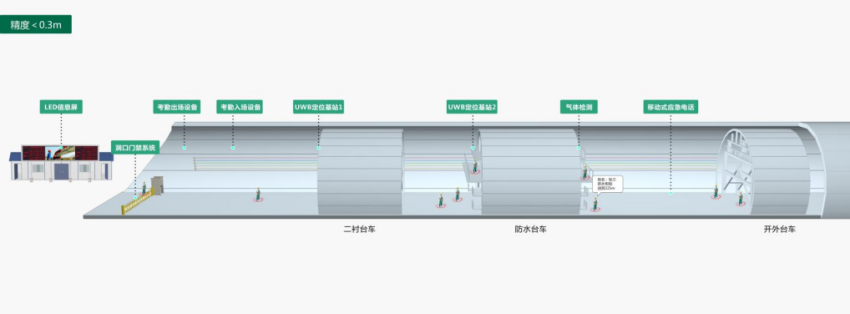 UWB精确定位人(rén)員定位設備信号可(kě)覆蓋500m(兩側、無遮擋),第一台基站安裝在距洞口200m左右洞壁上(shàng),安裝高(gāo)度3-4m,全線定位間隔500m安裝一台基站,注意區分(fēn)天線方向(否者定位方向會(huì)反),盡量遠離(lí)金(jīn)屬,距離(lí)不低于30cm。最前方的(de)定位基站可(kě)安裝在防水(shuǐ)台車(chē)上(shàng),跟随台車(chē)移動。用(yòng)來定位開(kāi)挖面及二襯施工(gōng)區域。定位基站采用(yòng)AC-220V供電。